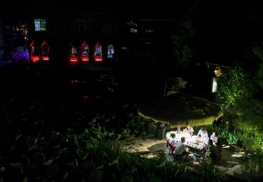 Tourists enjoy their leisure at a homestay in Xianrendong Village of Qiubei County, southwest China's Yunnan Province, May 30, 2023. The village is committed to developing tourism based on its unique natural landscape and Yi ethnic features. (Xinhua/Lan Hongguang)