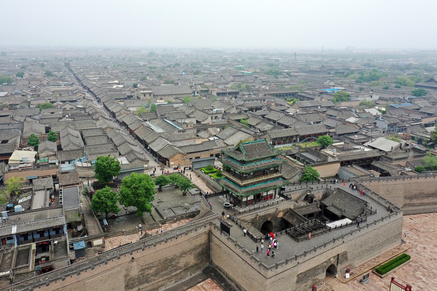 This aerial photo taken on May 30, 2023 shows the Pingyao ancient city, north China's Shanxi Province. (Xinhua/Zhan Yan)
