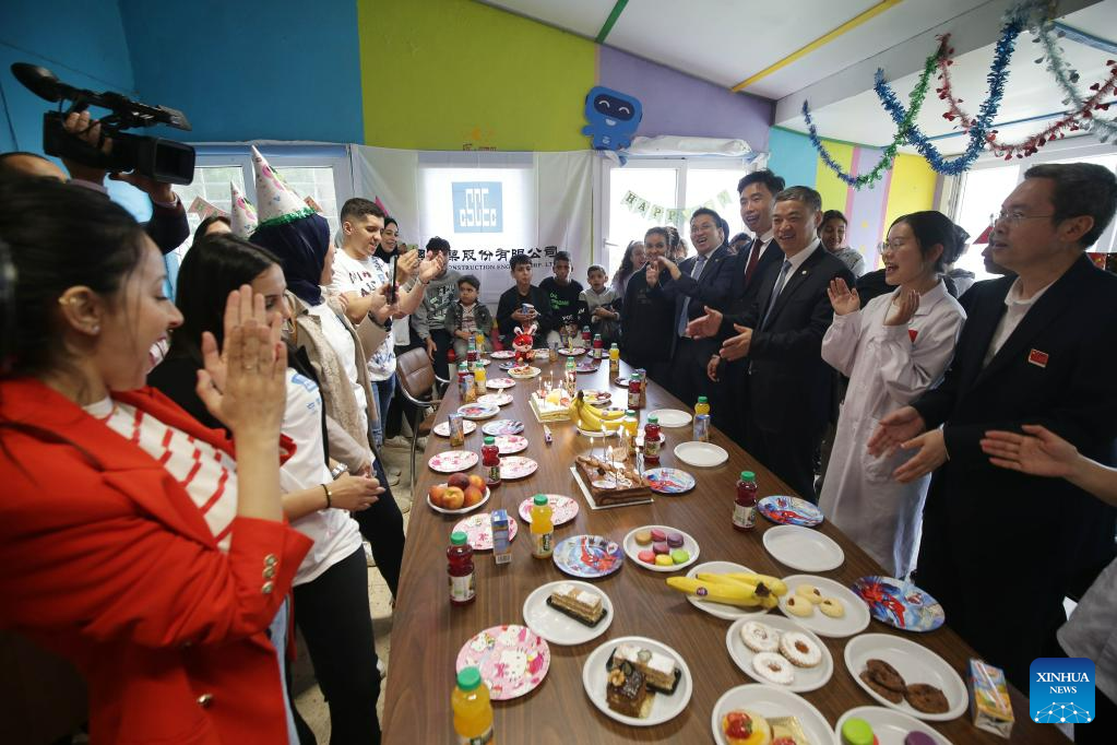 Representatives from the Chinese Embassy in Algeria, a Chinese medical team, and the China State Construction Engineering Corporation (CSCEC) Algeria, hold an International Children's Day activity at Draria Children's Village in Algiers, Algeria, on May 31, 2023. The orphanage on Wednesday welcomed a charity event organized by the Chinese embassy ahead of the International Children's Day. (Xinhua)