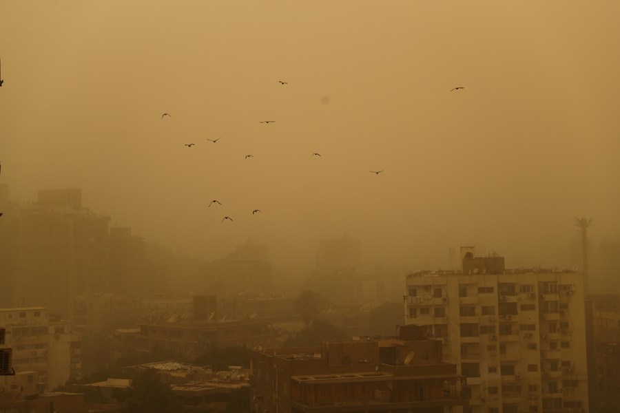 The photo taken on June 1, 2023 shows buildings shrouded in heavy dust during a sandstorm in Cairo, Egypt. (Xinhua/Sui Xiankai)