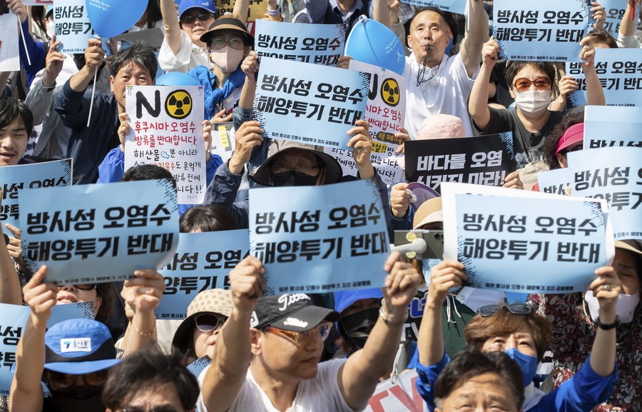 People rally to protest against Japan's planned discharge of radioactive wastewater into the Pacific Ocean in Seoul, South Korea on May 20, 2023. (Photo by James Lee/Xinhua)