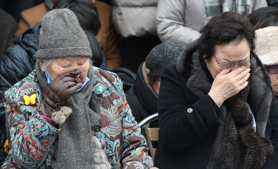 Lee Yong-su (L front), a South Korean victim who was forced into sex slavery for Japan's military brothels during World War II, takes part in the funeral ceremony of a symbolic South Korean victim Kim Bok-dong in Seoul, South Korea on Feb. 1, 2019. (Xinhua/Lee Sang-ho)