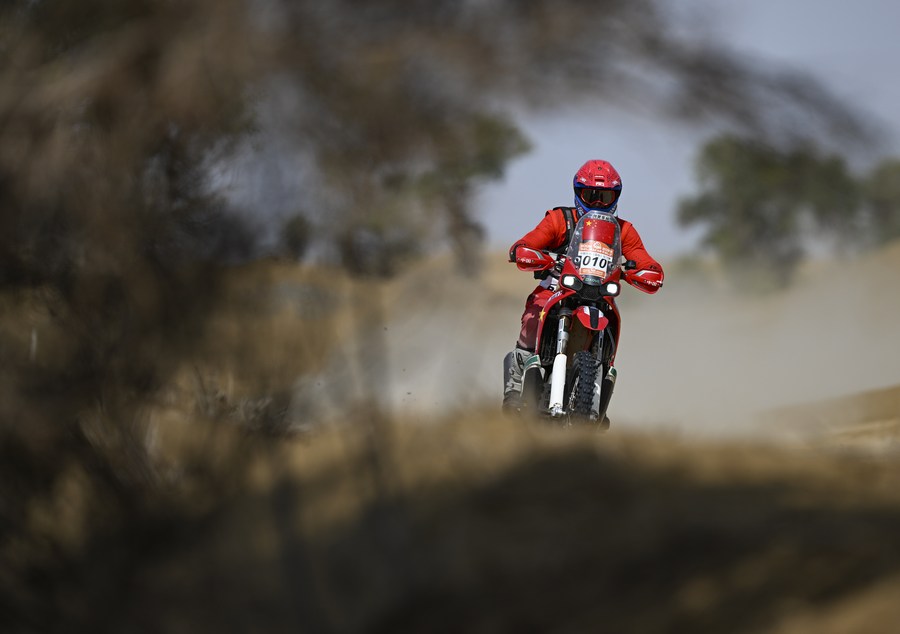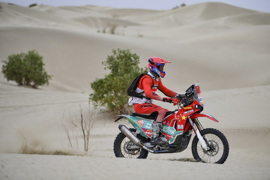 Kove Moto Team's Neels Theric in action in the sixth stage of the 2023 Taklimakan Rally held in Xinjiang Uygur Autonomous Region, China on May 28, 2023. (Xinhua/Hu huhu)