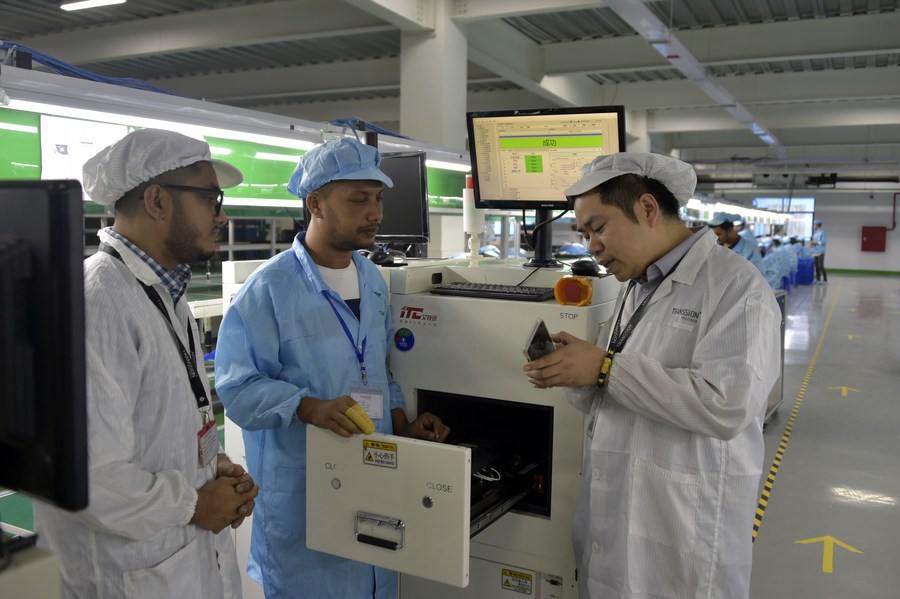 A Chinese engineer works with Bangladeshi workers at the new factory of Transsion Holdings in the Meghna Industrial Economic Zone, Narayanganj, Bangladesh on May 24, 2023. (Xinhua)