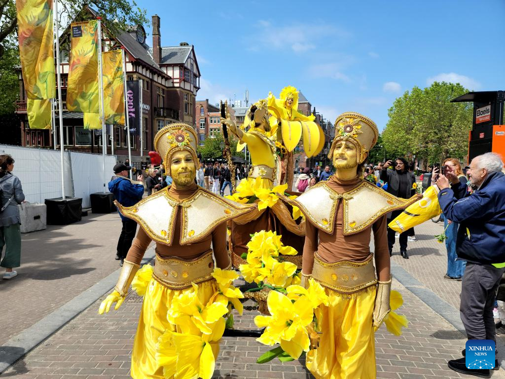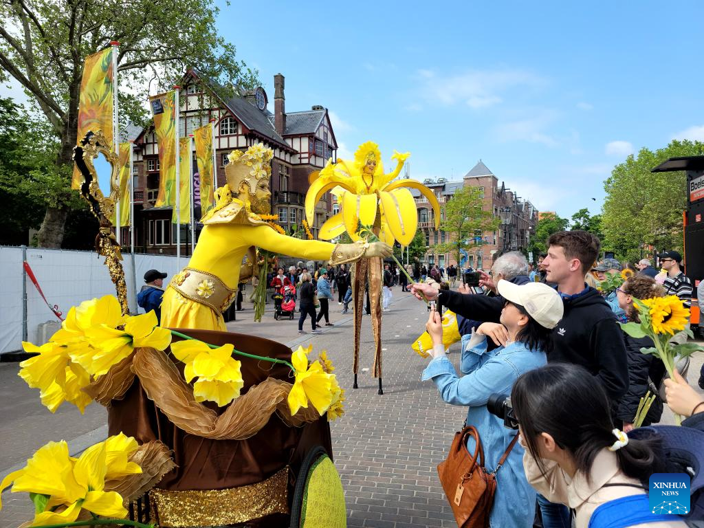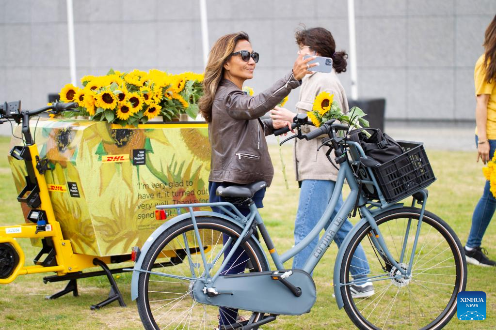 An actor distributes sunflowers to visitors during festive activities to commemorate the 50th anniversary of the Van Gogh Museum on the Museum Square in Amsterdam, the Netherlands, June 2, 2023. The Van Gogh Museum hosted a series of festive activities here to commemorate its 50th anniversary and honor the legacy of Vincent van Gogh, one of the most famous and prolific Dutch artists.