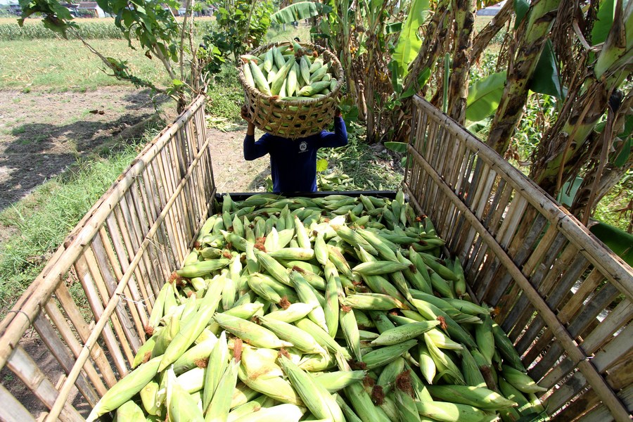 A farmer unloads sweet corn to a vehicle in Gatak village in Sukoharjo, Indonesia on June 2, 2023. (Photo by Bram Selo/Xinhua)