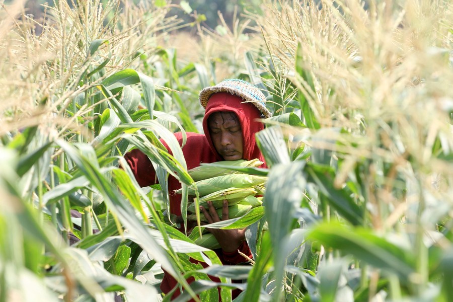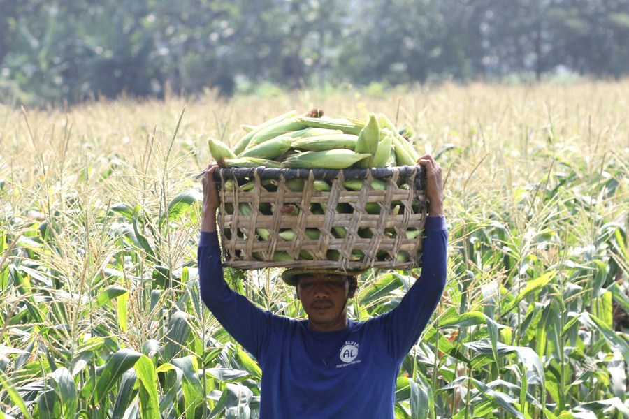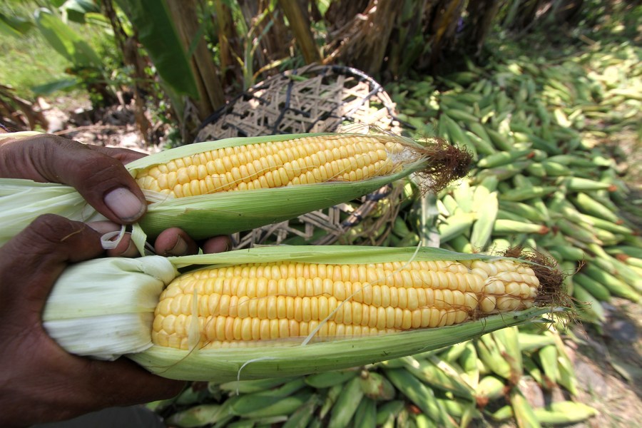 A farmer shows newly-harvested sweet corn at Gatak village in Sukoharjo, Indonesia on June 2, 2023. (Photo by Bram Selo/Xinhua) ■