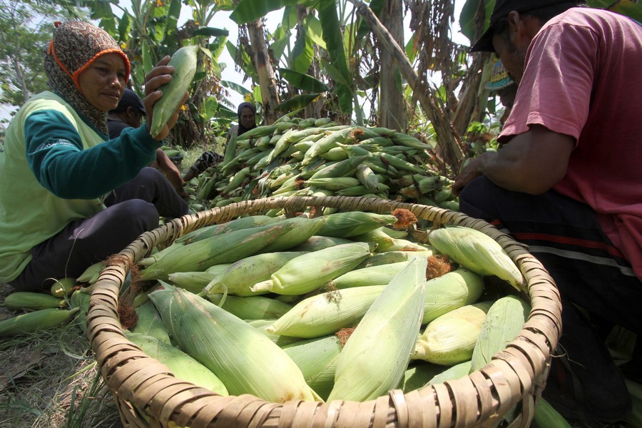 Farmers sort sweet corn in Gatak village in Sukoharjo, Indonesia on June 2, 2023. (Photo by Bram Selo/Xinhua)