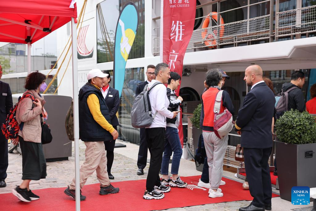 Chinese guests board the Viking Eistla cruise ship in Amsterdam, the Netherlands, June 1, 2023. The multinational travel company Viking Cruises has resumed its European river cruise operations catering to the Chinese market. (Viking Cruises/Handout via Xinhua)