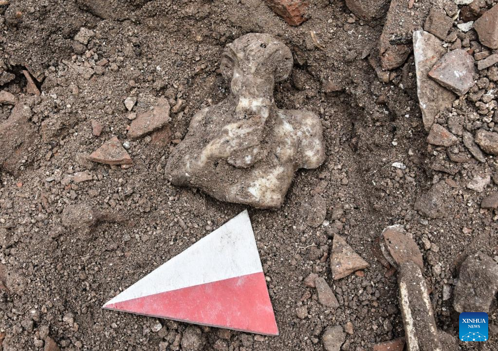 This undated photo provided by the Istanbul Municipality shows an ancient statue of the Greek god Pan at the excavation site where it was found in Istanbul, Türkiye. An ancient statue of the Greek god Pan was discovered in urban Istanbul, the mayor of the mega Turkish city announced Thursday. A marble statue of Pan dating back to the Roman era was unearthed at the Byzantine church of St. Polyeuctus located in the Sarachane Archeology Park, Ekrem Imamoglu said on social media, adding the artifact was believed to be 1700-year-old. (Omer Kuscu/Istanbul Municipality/Handout via Xinhua)