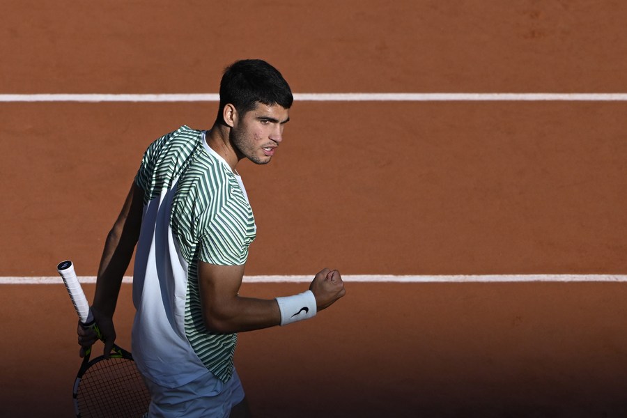 Carlos Alcaraz of Spain reacts during the men's singles fourth round match against Lorenzo Musetti of Italy at the French Open tennis tournament at Roland Garros in Paris, France, June 4, 2023. (Photo by Julien Mattia/Xinhua)