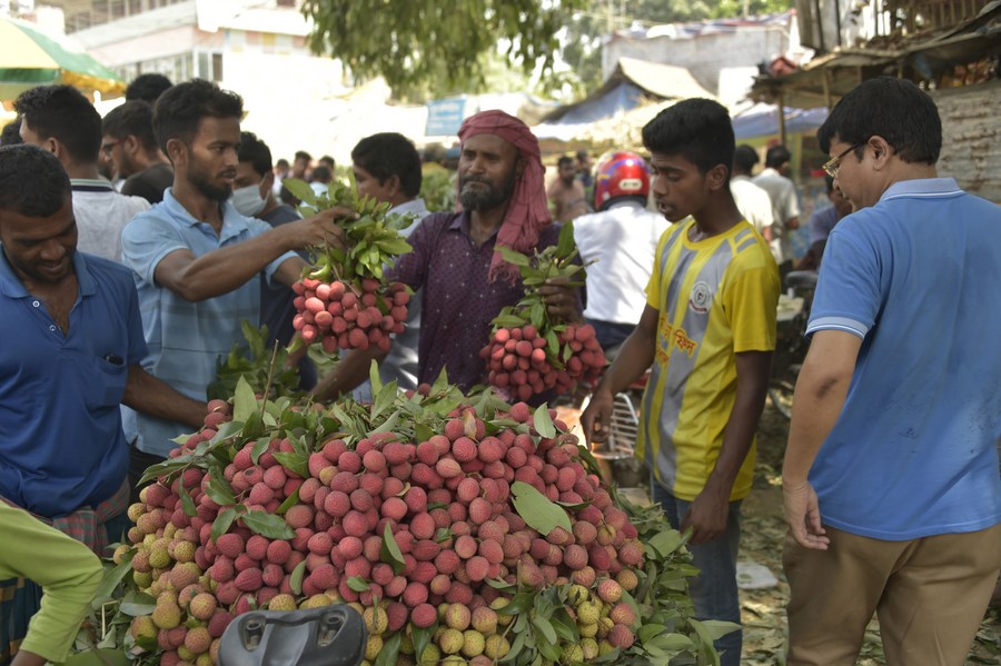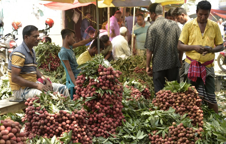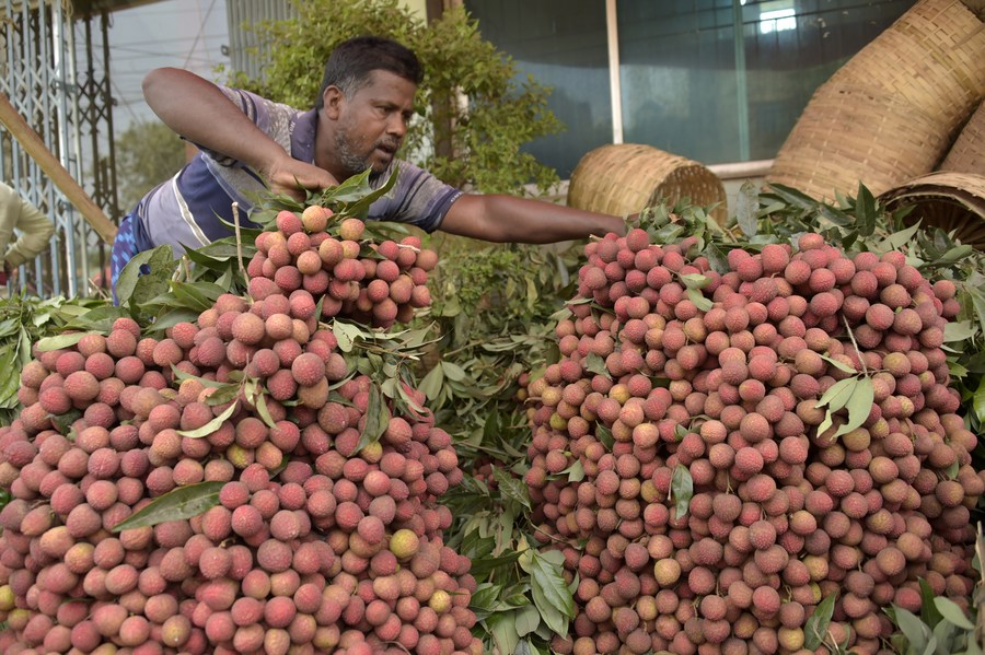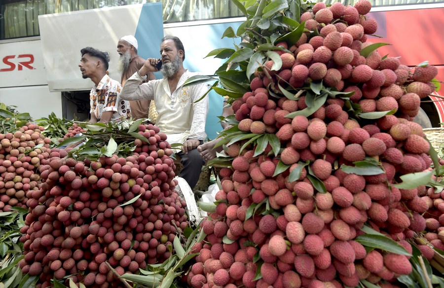 Photo shows lychees for sale at a market in Dinajpur, Bangladesh on June 4, 2023. (Xinhua)
