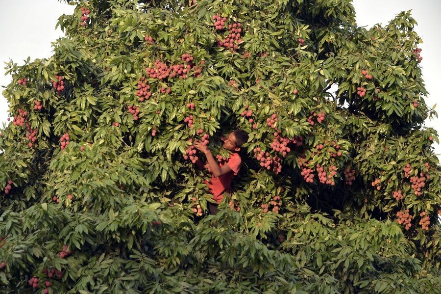 A boy harvests lychees at an orchard in Dinajpur, Bangladesh on June 4, 2023. (Xinhua)