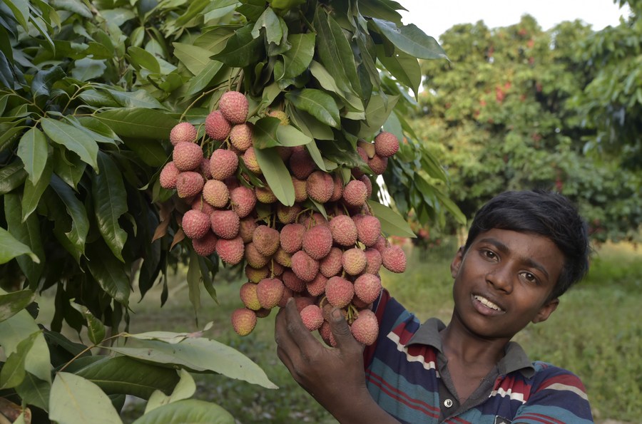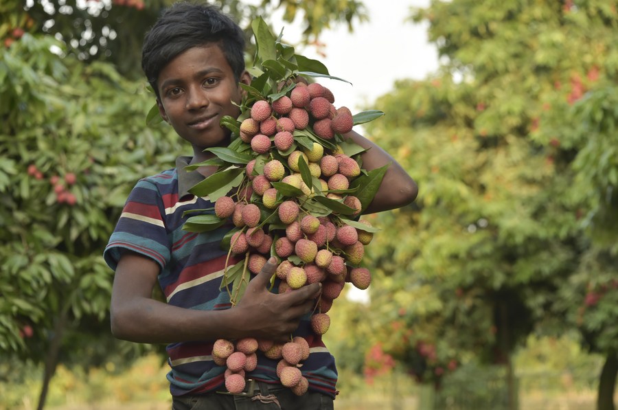 A boy shows lychees at an orchard in Dinajpur, Bangladesh on June 4, 2023. (Xinhua)