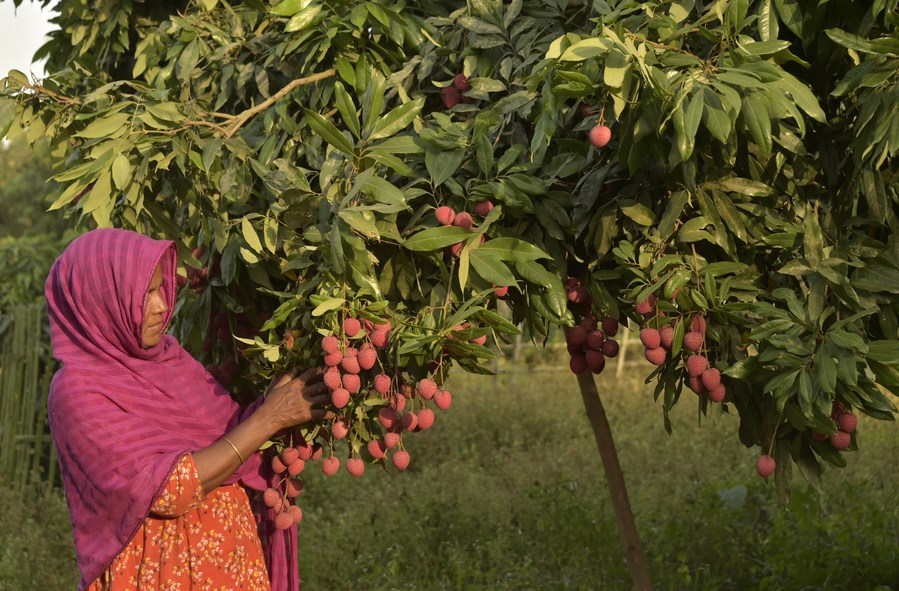 A woman harvests lychees at an orchard in Dinajpur, Bangladesh on June 4, 2023. (Xinhua)