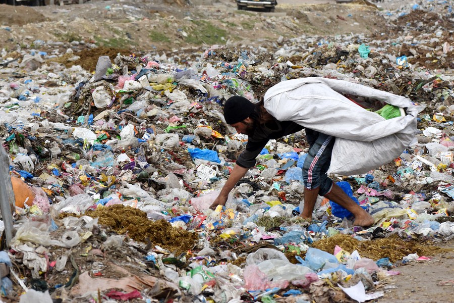 A scavenger collects recyclable plastic material at a garbage dump site in Lahore, Pakistan on June 5, 2023. (Photo by Sajjad/Xinhua)■