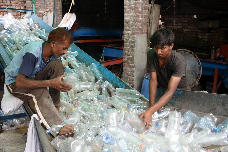 Workers check recycled plastic bottles at a recycle workshop in Lahore, Pakistan on June 5, 2023. (Photo by Sajjad/Xinhua)
