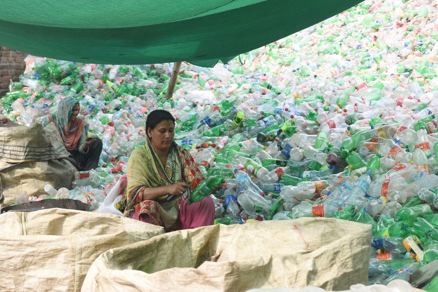 Workers check recyclable plastic bottles at a recycle workshop in Lahore, Pakistan on June 5, 2023. (Photo by Sajjad/Xinhua)