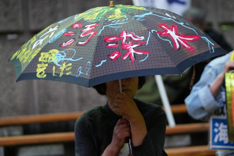 A woman protests against the Japanese government's plan to discharge nuclear-contaminated water into the sea at Hibiya Open-Air Concert Hall in Tokyo, Japan, May 16, 2023. (Xinhua/Zhang Xiaoyu)