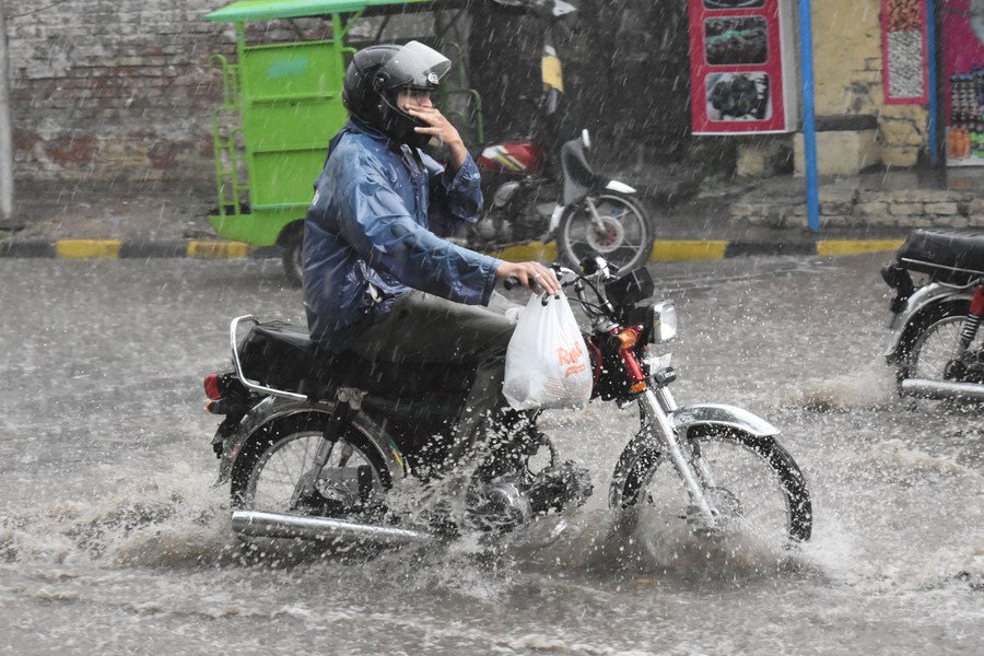 LAHORE, Pakistan, June 7 (Xinhua) -- Heavy rains hit Lahore, Pakistan with the rainwater flooding the road, causing inconvenience for people's daily life.