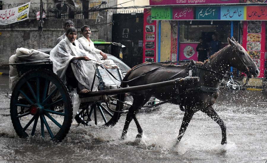 People ride a horse-cart amid heavy rainfall in Lahore, Pakistan on June 6, 2023. (Photo by Sajjad/Xinhua)