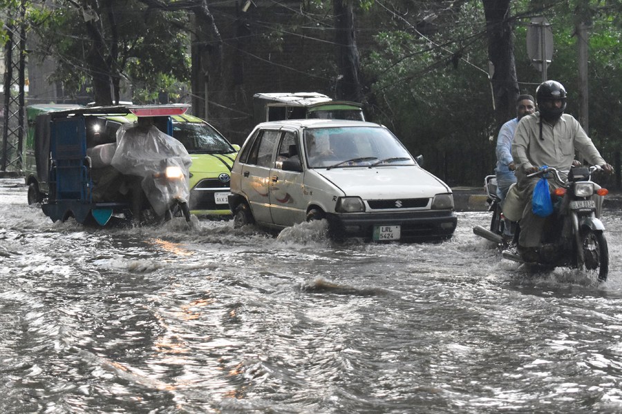 Vehicles run on a flooded road after heavy rainfall in Lahore, Pakistan on June 6, 2023. (Photo by Sajjad/Xinhua)