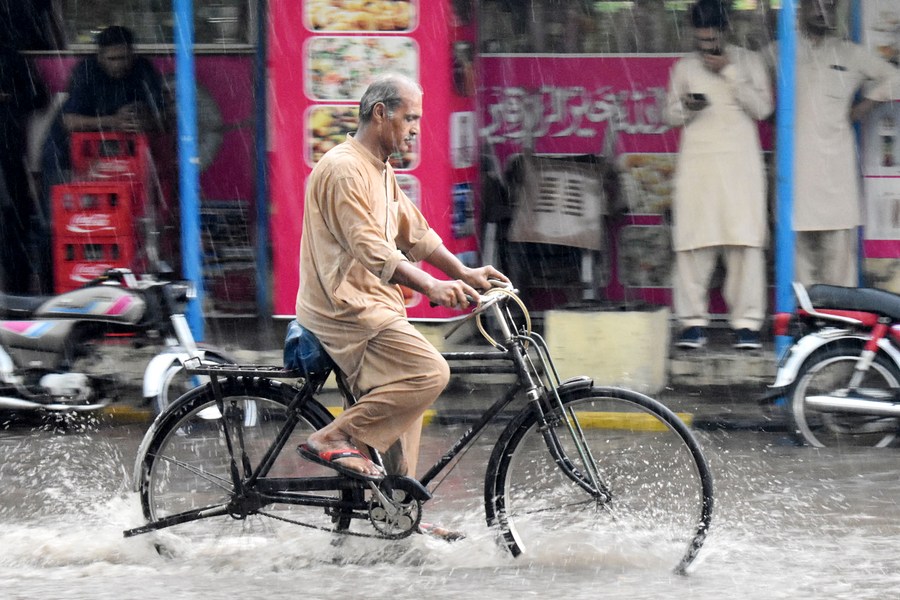 A man rides a bicycle amid heavy rainfall in Lahore, Pakistan on June 6, 2023. (Photo by Sajjad/Xinhua)