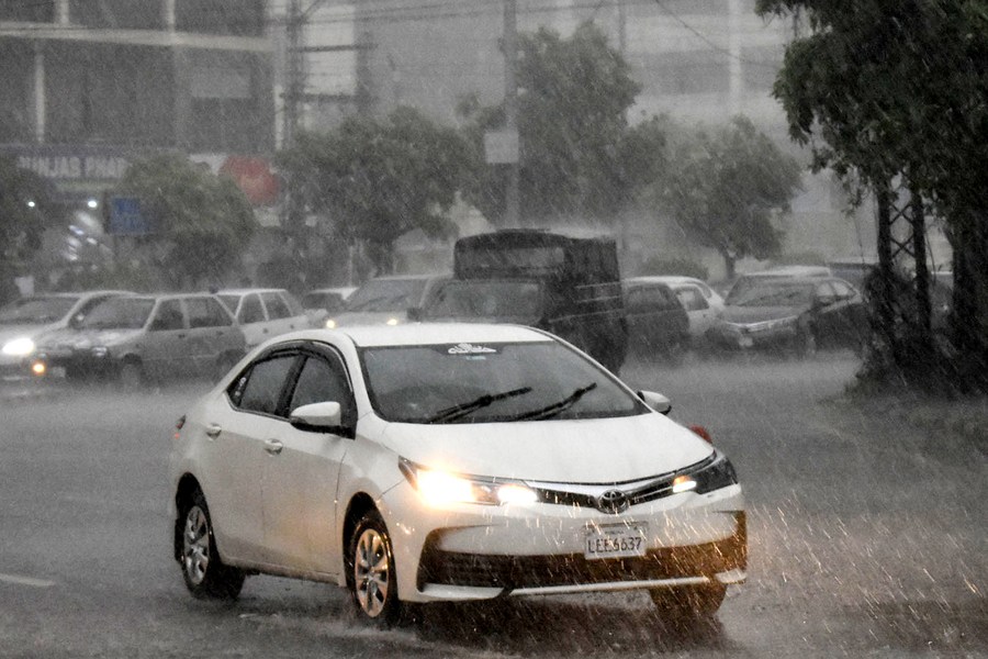 Vehicles run on a road amid heavy rainfall in Lahore, Pakistan on June 6, 2023. (Photo by Sajjad/Xinhua)