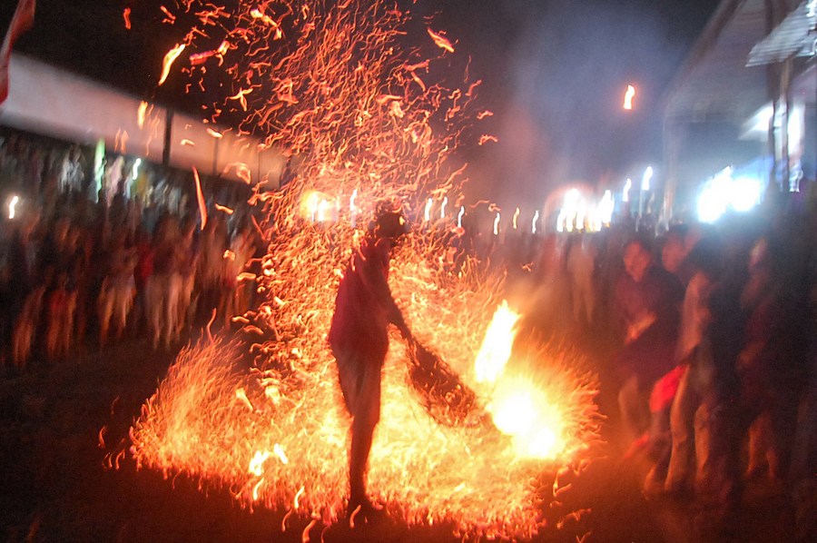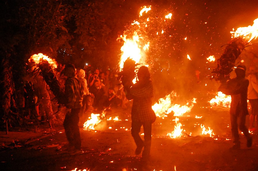 This tradition is marked by lighting the fronds of dried coconut and bananas. The participants swing away the torch at each other, believing that the flame could bring health.