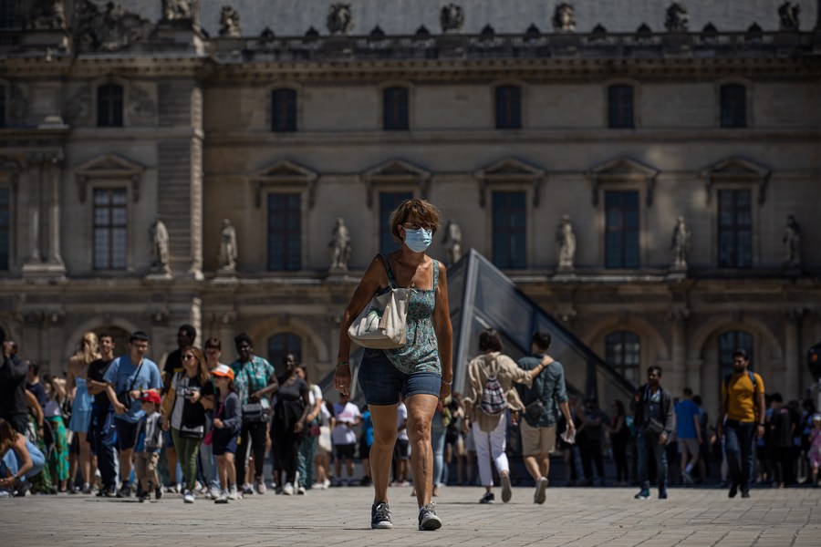 A woman wearing a face mask walks in front of the Louvre Museum in Paris, France, July 8, 2022. (Photo by Aurelien Morissard/Xinhua)