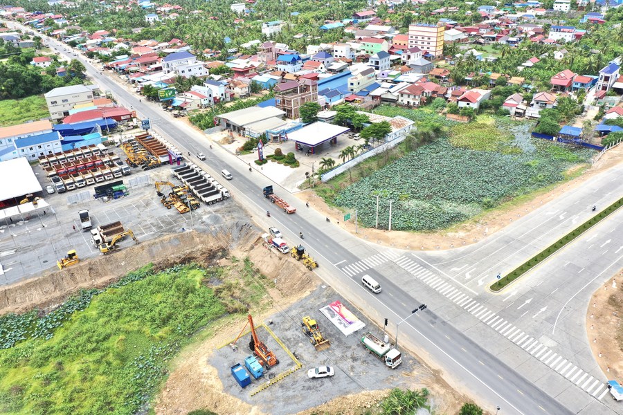This aerial photo taken on June 5, 2023 shows the construction site of Phnom Penh-Bavet Expressway, the kingdom's second Chinese-invested expressway, in Kandal province, Cambodia. Cambodia on June 7 broke ground on the second Chinese-invested expressway connecting the capital Phnom Penh with Bavet City of Svay Rieng province on the border with Vietnam. (Photo by Ly Lay/Xinhua)