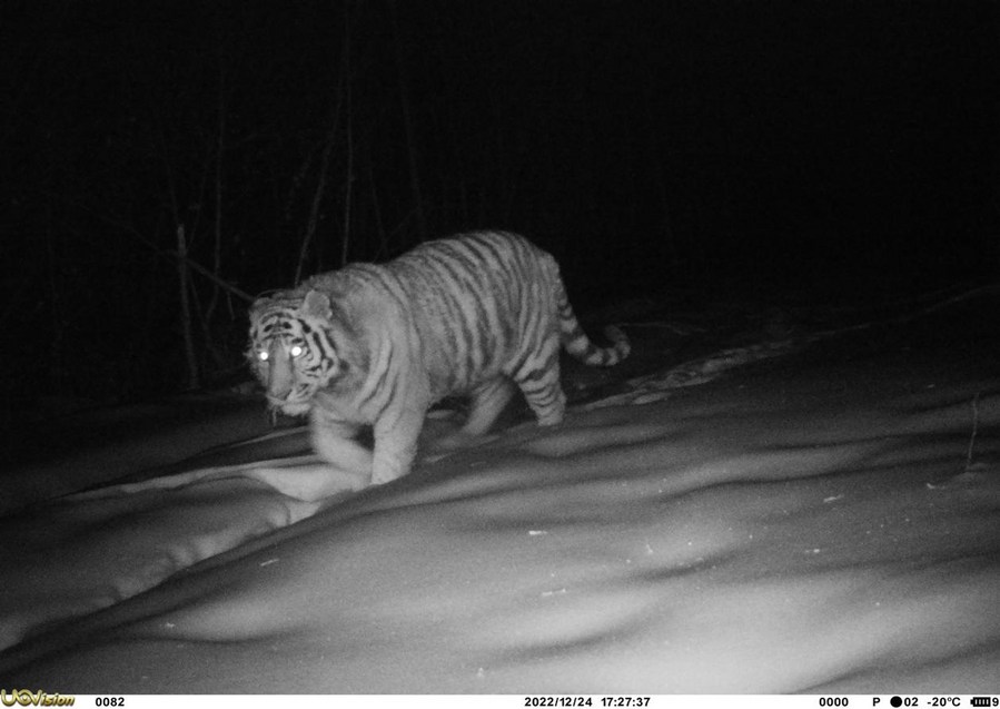 This photo taken by an infrared camera on Dec. 24, 2022 shows a wild Siberian tiger in the Greater Hinggan Mountains in northeast China's Heilongjiang Province. (Heilongjiang Forestry and Grassland Bureau/Handout via Xinhua)