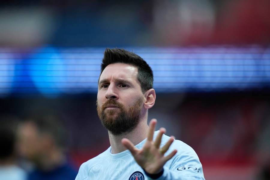 Lionel Messi warms up before a Ligue 1 match between Paris Saint-Germain and AC Ajaccio in Paris, France on May. 13, 2023. (Photo by Glenn Gervot/Xinhua)