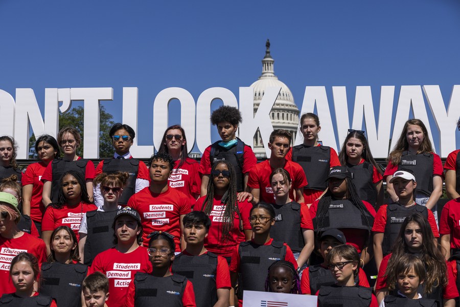 Students wearing bulletproof vests hold a rally near the Capitol Reflecting Pool in Washington, D.C., the United States, June. 6, 2022. (Photo by Aaron Schwartz/Xinhua)