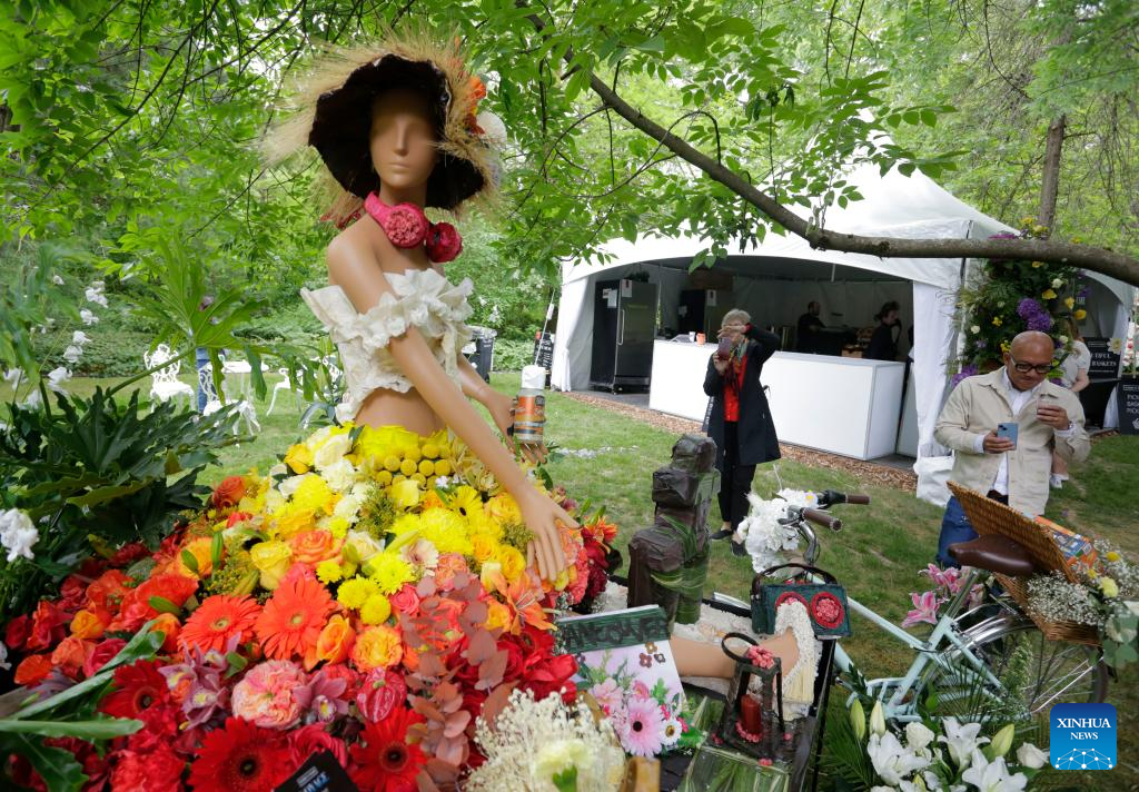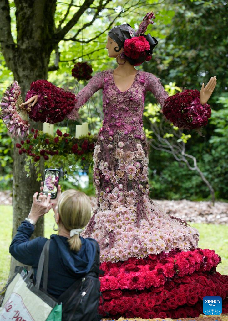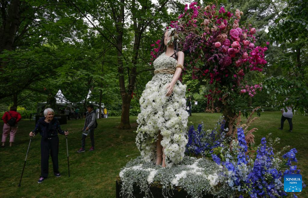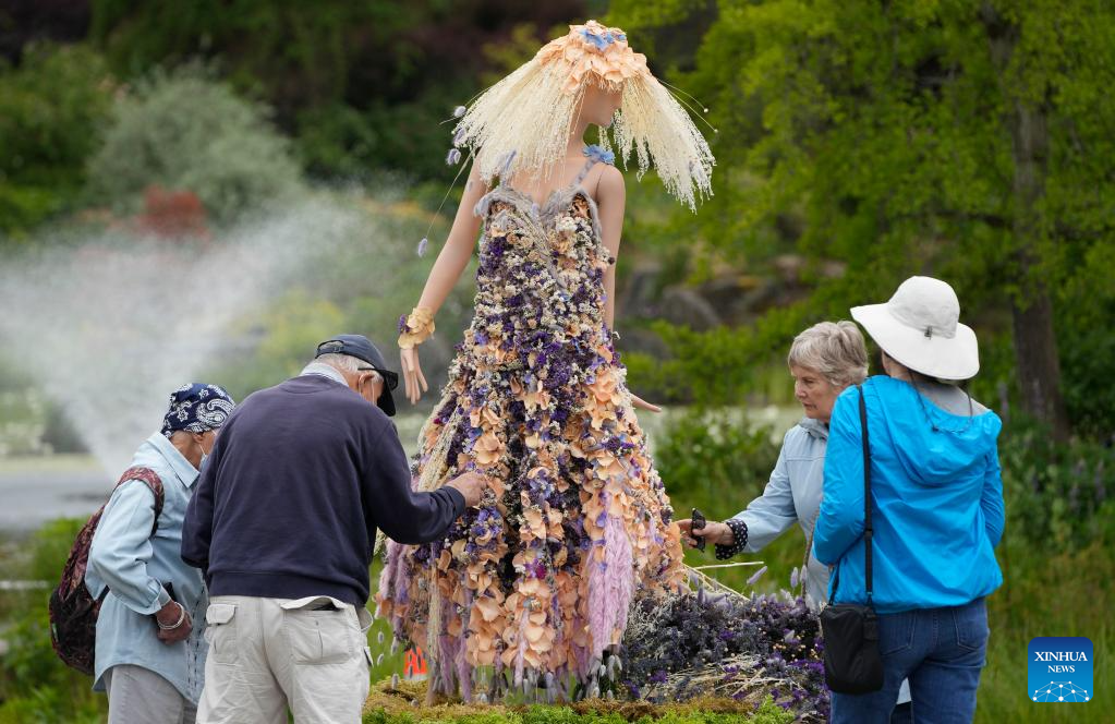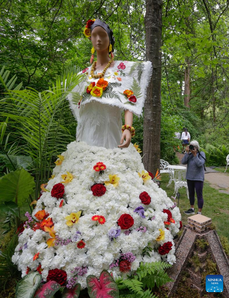 People view a floral mannequin during the Fleurs de Villes VOYAGE exhibition at VanDusen Botanical Garden in Vancouver, British Columbia, Canada, on June 9, 2023. The renowned floral exhibition, presenting more than 15 floral mannequins and installations inspired by iconic global destinations, kicked off here on Friday. (Photo by Liang Sen/Xinhua)