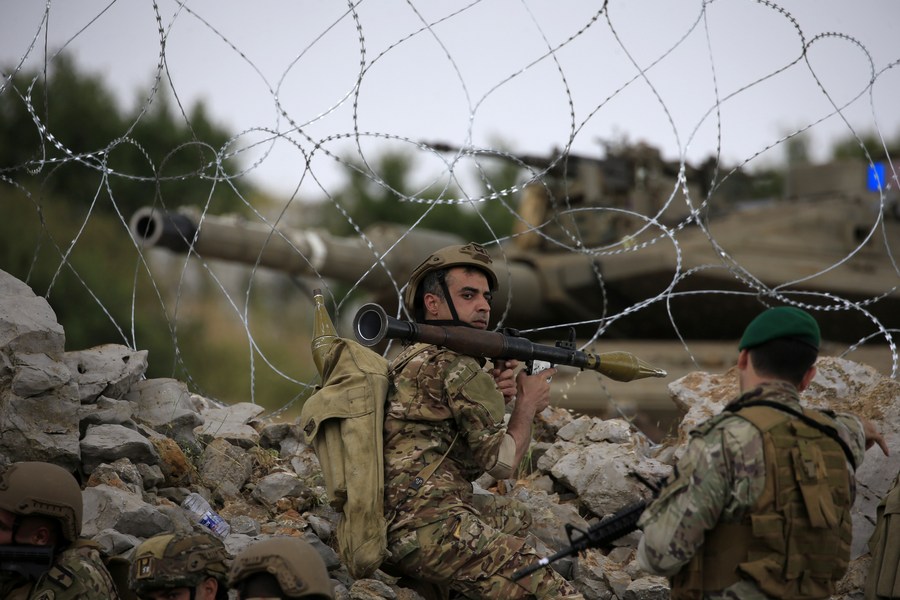 Soldiers of the Lebanese army carry their weapons in the Lebanese village of Kfarchouba, June 9, 2023. (Photo by Ali Hashisho/Xinhua)