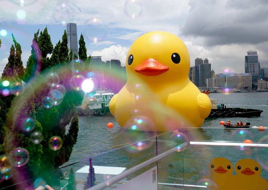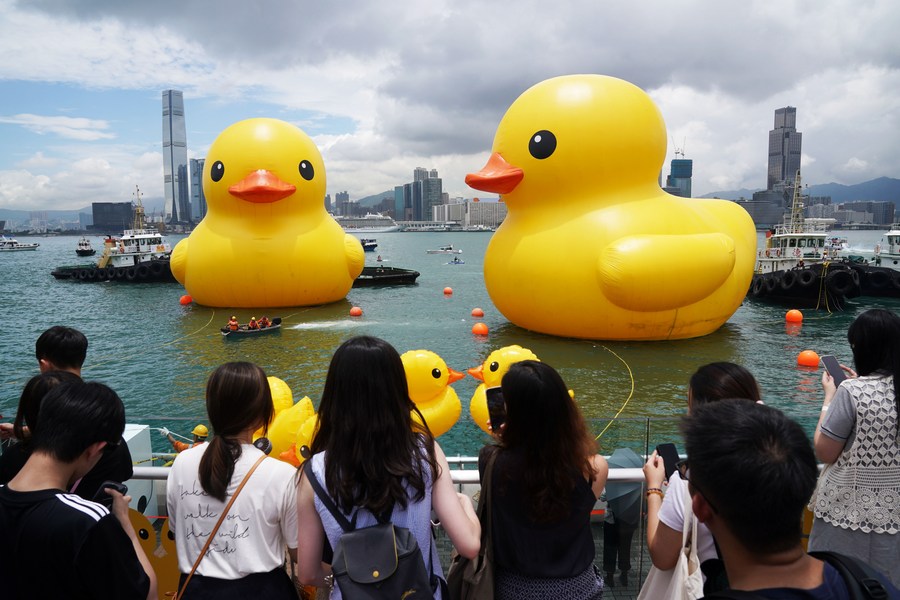 HONG KONG, June 10 (Xinhua) -- A pair of giant rubber ducks captured the attention of Hongkongers on Friday as they floated in Victoria Harbor as part of a public art exhibition that aims to bring more joy to the city.