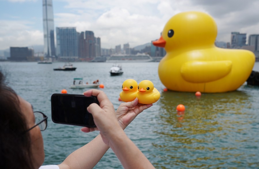 A giant yellow rubber duck is seen at Victoria Harbor in Hong Kong, south China, June 9, 2023. (Xinhua/Wang Shen)
