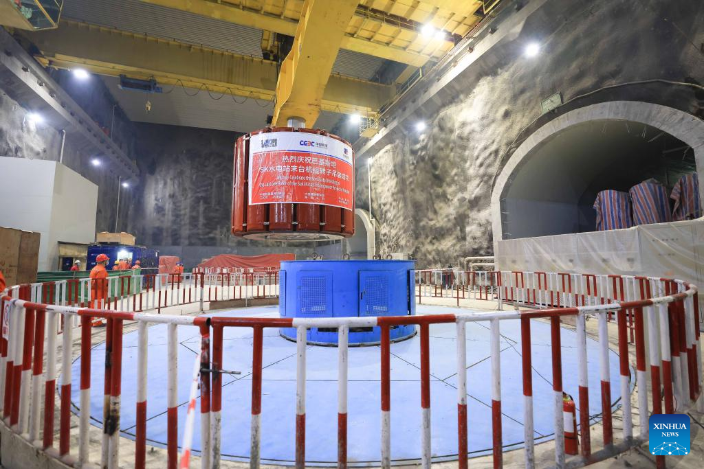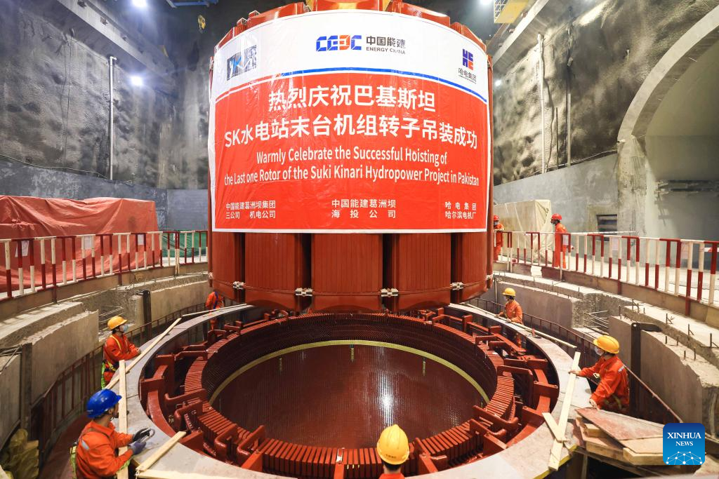 ISLAMABAD, June 10 (Xinhua) -- The Suki Kinari Hydropower project in northwest Pakistan achieved the hoisting of a core component on Saturday, as a 413-ton rotor, crucial to turning water into electricity, was smoothly installed on the last of four generating units.