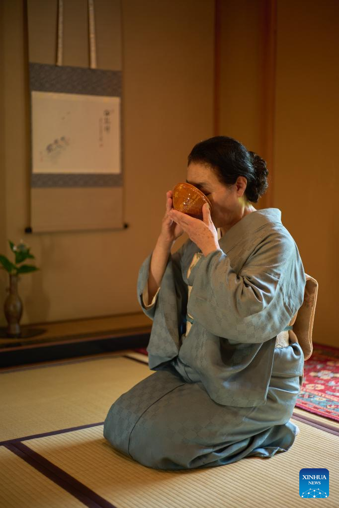 Tea Master Asami Yaeko demonstrates the drinking of matcha in the tea ceremony room at her home in Saitama, Japan, on June 10, 2023.
