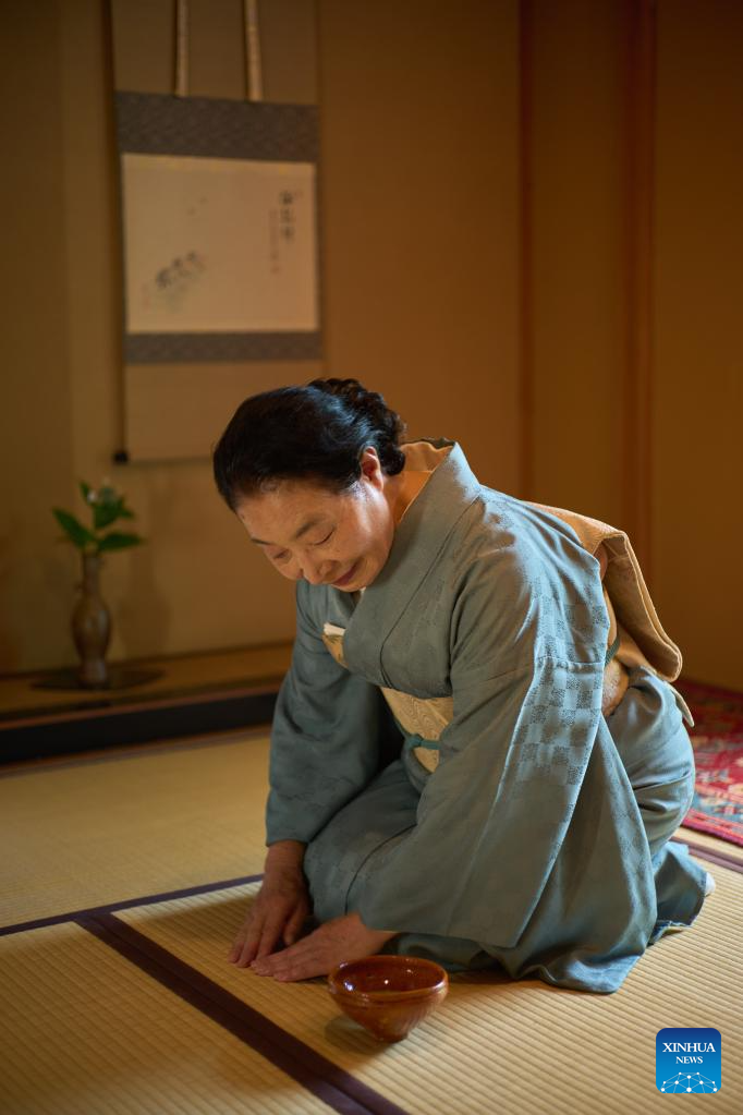 Tea Master Asami Yaeko demonstrates a bow to thank the serving of macha in the tea ceremony room at her home in Saitama, Japan, on June 10, 2023.