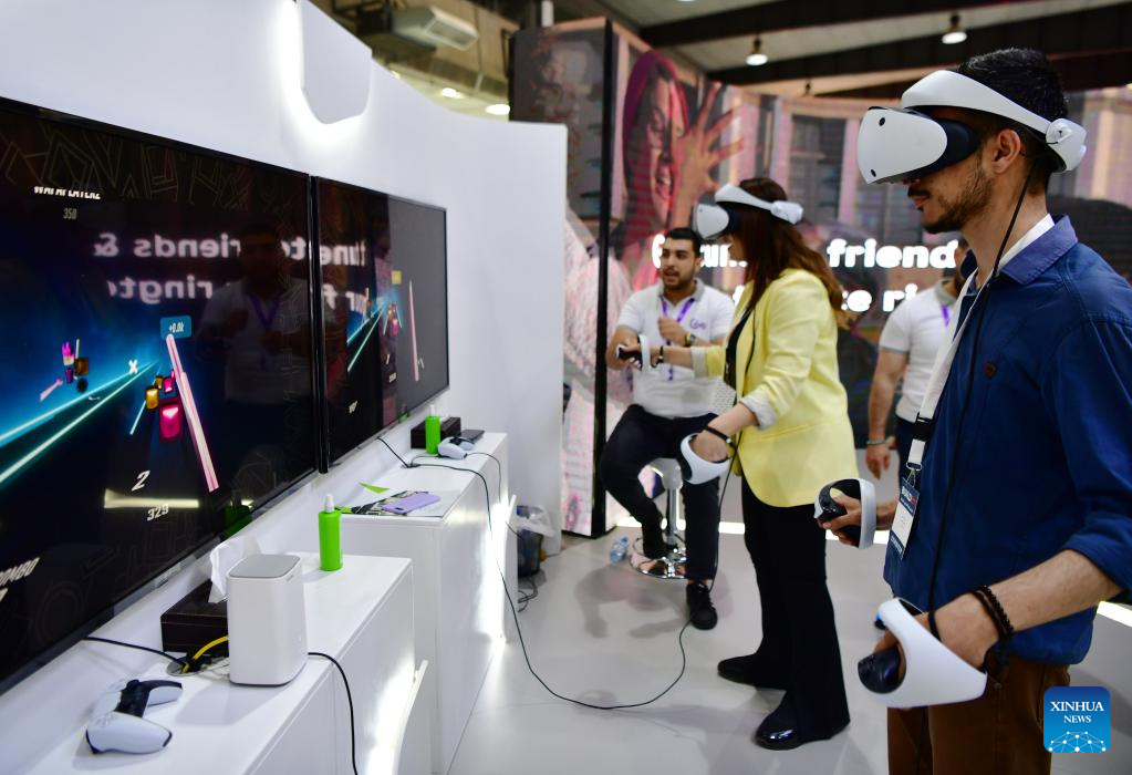 People wearing VR headsets are seen at an exhibition of technologies in Damascus, Syria, on June 10, 2023. (Photo by Ammar Safarjalani/Xinhua)