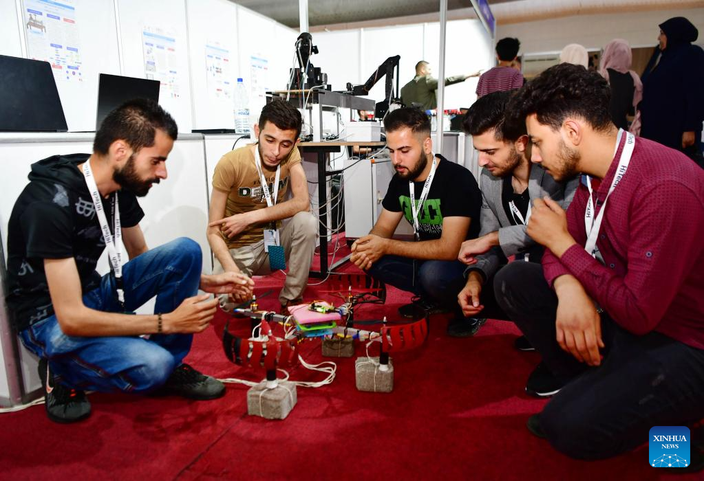 Young men are seen at an exhibition of technologies in Damascus, Syria, on June 10, 2023. (Photo by Ammar Safarjalani/Xinhua)