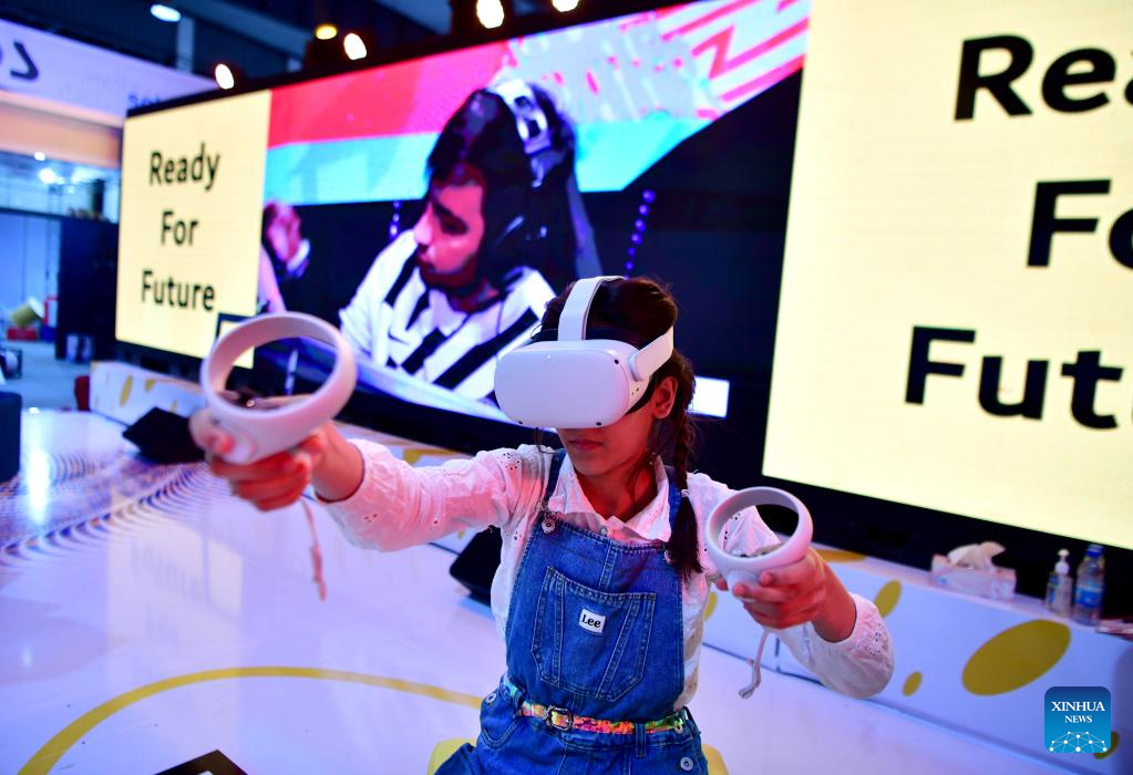 A girl wearing a VR headset is seen at an exhibition of technologies in Damascus, Syria, on June 10, 2023. (Photo by Ammar Safarjalani/Xinhua)