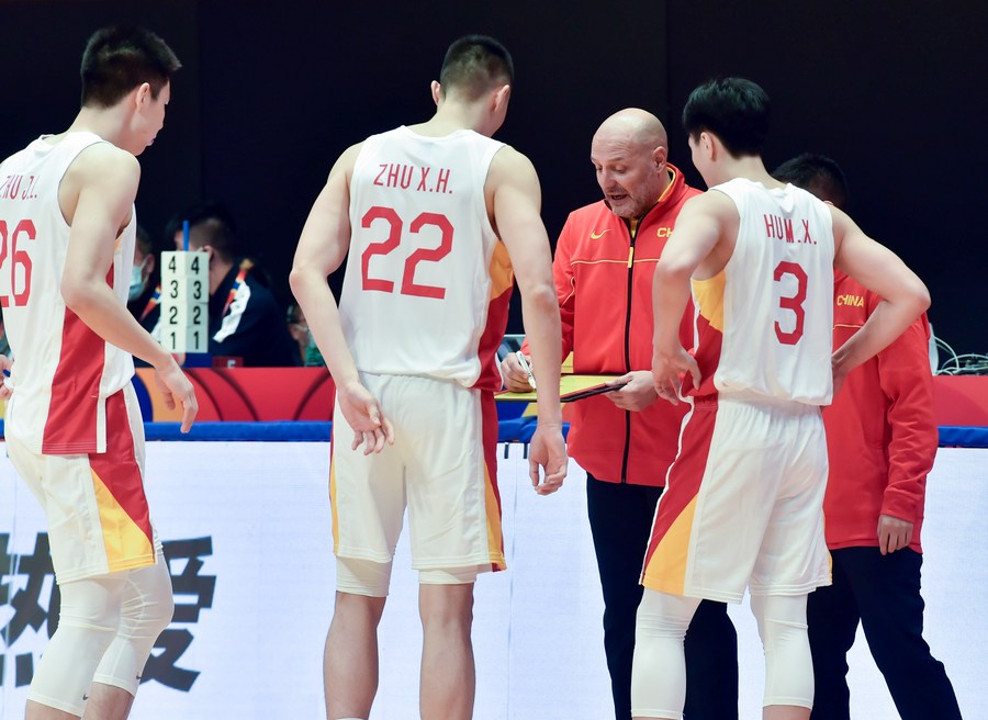 China head coach Aleksandar Djordjevic (3rd L) instructs his players during the FIBA World Cup Asian Qualifier Group F match between China and Kazakhstan in Hong Kong, China, Feb. 23, 2023. (Xinhua/Lo Ping Fai)