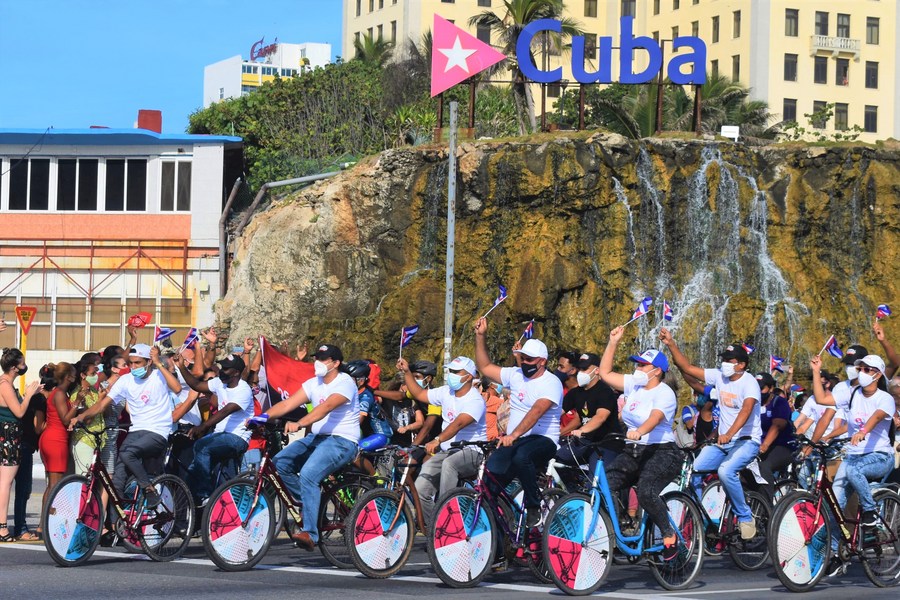 People participate in a rally against U.S. embargo in Havana, Cuba, Aug. 5, 2021. (Photo by Joaquin Hernandez/Xinhua)