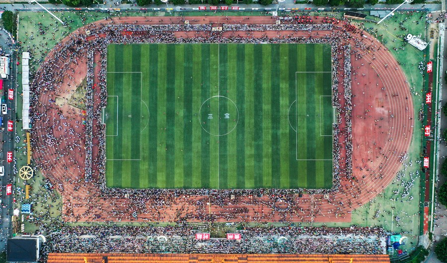 This aerial photo taken on June 10, 2023 shows a "Village Super League" football match in Rongjiang County of southwest China's Guizhou Province. (Xinhua/Yang Wenbin)