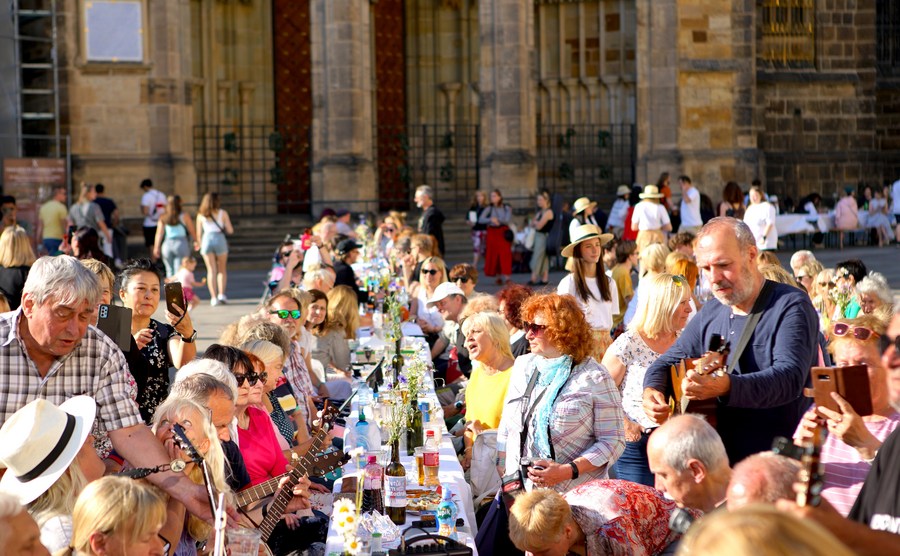 People take part in a long table event at Prague Castle in Prague, the Czech Republic, on June 12, 2023. A roughly 400-meter-long table in the shape of a heart was set up around St. Vitus Cathedral at Prague Castle on Monday. Prague's residents and visitors were welcomed to join the event with their own dishes and share with others. (Photo by Dana Kesnerova/Xinhua)