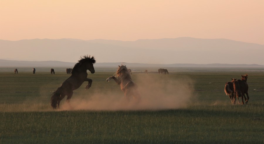 Horses are seen on a grassland at province of Zavkhan in Mongolia, June 10, 2023. (Xinhua/Asigang)