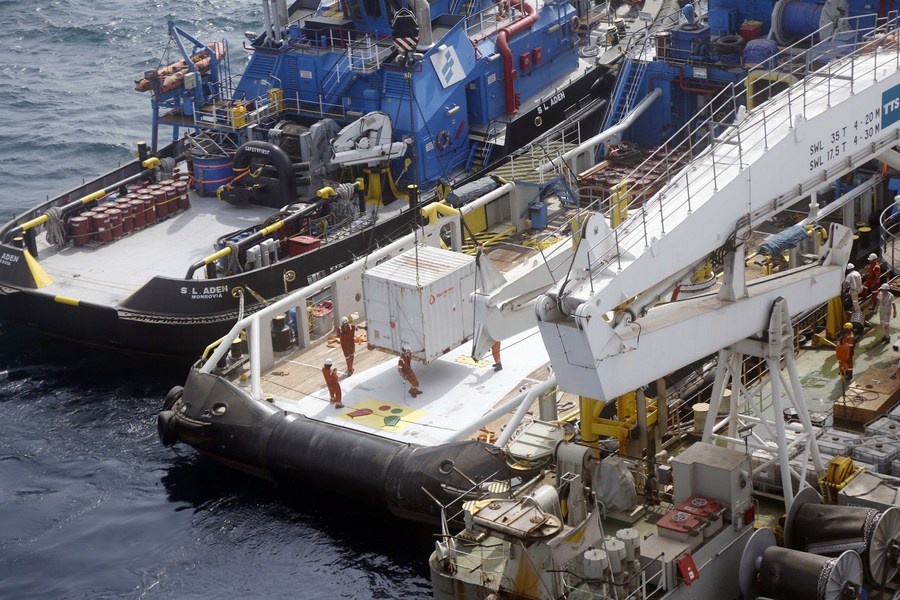 Engineers hired by the United Nations work on a vessel docked with the FSO Safer vessel at Ras Issa port in Hodeidah province, Yemen, on June 12, 2023. The United Nations Development Programme (UNDP) announced on Monday that it has secured insurance for the FSO Safer, a decaying oil tanker moored off the coast of Yemen. (Photo by Mohammed Mohammed/Xinhua)■